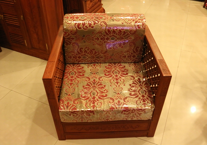 單人座沙發(fā)外觀方正匡整,兩邊扶手的高度設(shè)計的與靠背同高,而在其內(nèi)外兩側(cè)均雕繪有幅闌的鏤空幾何紋飾作為點綴,彰顯著浮美淡雅的中國風(fēng)式含蓄美。在沙發(fā)實際使用時,配上軟墊之后的坐感也更覺舒適,沙發(fā)座腳處地設(shè)計顯得地較為獨特,也可以說它已經(jīng)將座腳處設(shè)計的概念完全融入了沙發(fā)整體,以之整體式的箱體結(jié)構(gòu)作為座腳,更覺敦實、小巧玲瓏,頗有些許歐派家具式風(fēng)格的韻味,實為別致。